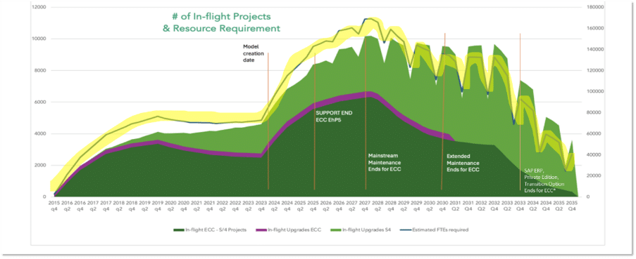This chart shows a steep rise in global SAP S/4HANA migration activity leading up to SAP’s 2027 and 2030 ECC support deadlines and illustrates that resource demand will dramatically exceed supply, creating a global delivery bottleneck that will impact costs, timelines, and project risk – source.