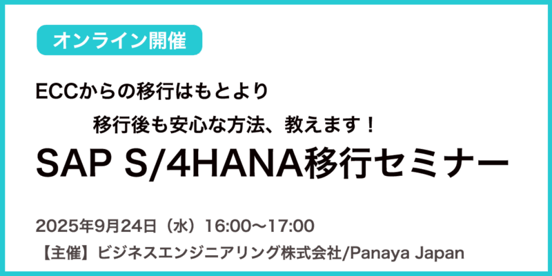 TOP セミナー・イベント 2025年9月24日(水)ECCからの移行はもとより移行後も安心な方法、教えます! SAP S/4HANA移行セミナー こちらのセミナーは終了しました。 セミナー その他のセミナー・イベント 受付中 2025年10月23日(木)Excel更新に追われ工数を浪費するERPやWebシステムのテスト運用、まだ続けますか? セミナー オンライン ライブ終了 2025年10月8日(水)RISE移行と2025アップグレード ― AIと自動化でSAP戦略を現実解にするPanaya セミナー オンライン ライブ終了 2025年10月2日(木) ERPプロジェクトの成功を阻む”属人化テスト”からの脱却 セミナー オンライン セミナー・イベント一覧を見る